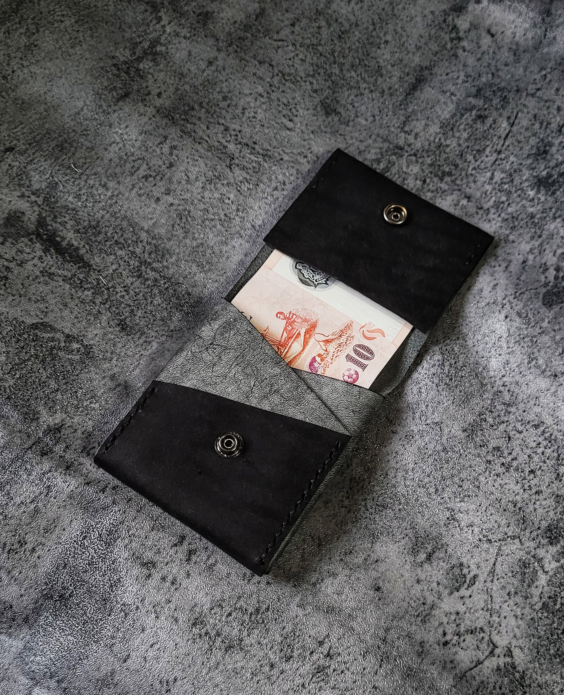 This wallet is entirely handmade with black waxed combined with black pueblo vegetable tan leather by the italian tannery , hand punched stitch holes and handstitched which allows thicker stitch threads to be used that gives it a robust construction.