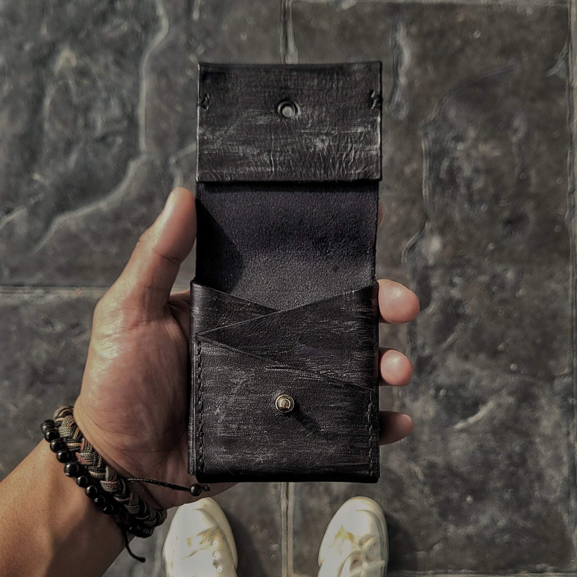 This wallet is entirely handmade with italian full grain cow leather, hand punched stitch holes and handstitched which allows thicker stitching threads to be used that gives it a robust construction.