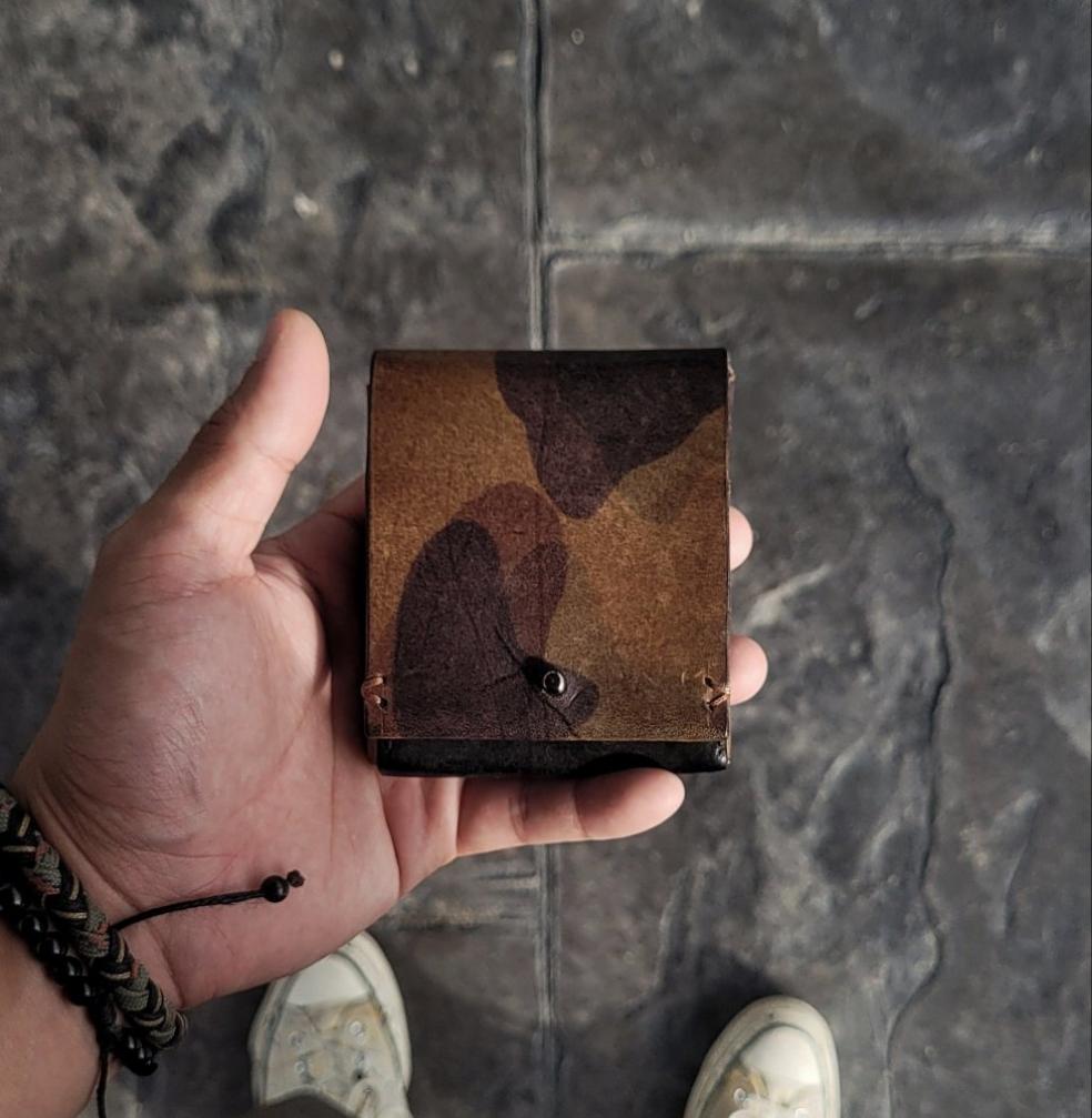 Made entirely by hand, this wallet features a Camouflage print wallet body with black Pockets, creating a unique and elegant look.